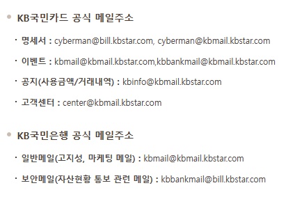 고객님께서는 E-mail주소가 아래 ‘KB국민카드 공식 메일주소’ 또는 ‘KB국민은행 공식 메일주소’와 상이한 경우 해당 메일을 삭제하여주시기 바랍니다.