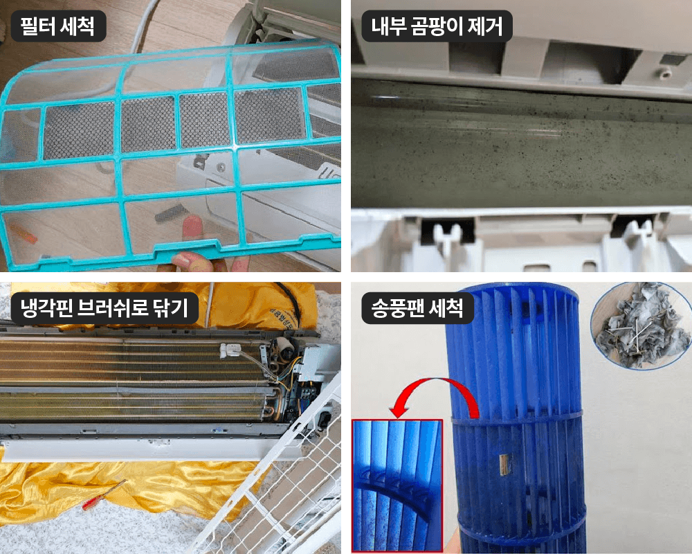 | 1단계: 필터 청소하기 공기필터 위에 쌓여 있던 먼지를 제거하고, 부드러운 솔로 닦아서 통풍이 잘되는 그늘에서 필터를 건조해 줍니다. 2단계: 에어컨 내부 곰팡이 제거하기 에어컨 내부에 쌓인 먼지와 곰팡이들을 남김없이 닦아줘요. 검은 곰팡이가 싹 사라질 때까지 깨끗하게 청소해 보세요. 3단계: 냉각핀 청소하기 냉각핀은 청소하기가 까다로워요. 잘못 닦으면 냉각핀이 구부러지면서 에어컨의 냉각 효율이 떨어질 수 있습니다. 장갑을 착용하고, 칫솔이나 청소 솔로 냉각핀 방향으로 쓸어주면서 먼지 및 곰팡이를 세척해 주세요. 집에 고압세척기가 있다면, 이걸 이용하는 게 간편해요. 4단계: 송풍팬 닦기 큰 욕조가 있다면 락스를 물로 희석한 뒤 송풍팬을 담궈놓으면 잘 닦여요. 욕조가 없다면 큰 봉투를 이용해서 곰팡이 찌든 때를 불려서 닦을 수 있어요. 청소를 마친 후, 결합하는 방법은 분해의 역순입니다. 볼트는 빼먹지 말고 다 조립해야 해요. 완전히 부품이 마른 뒤, 결합까지 완료하면 에어컨 분해 청소는 끝이에요! |
