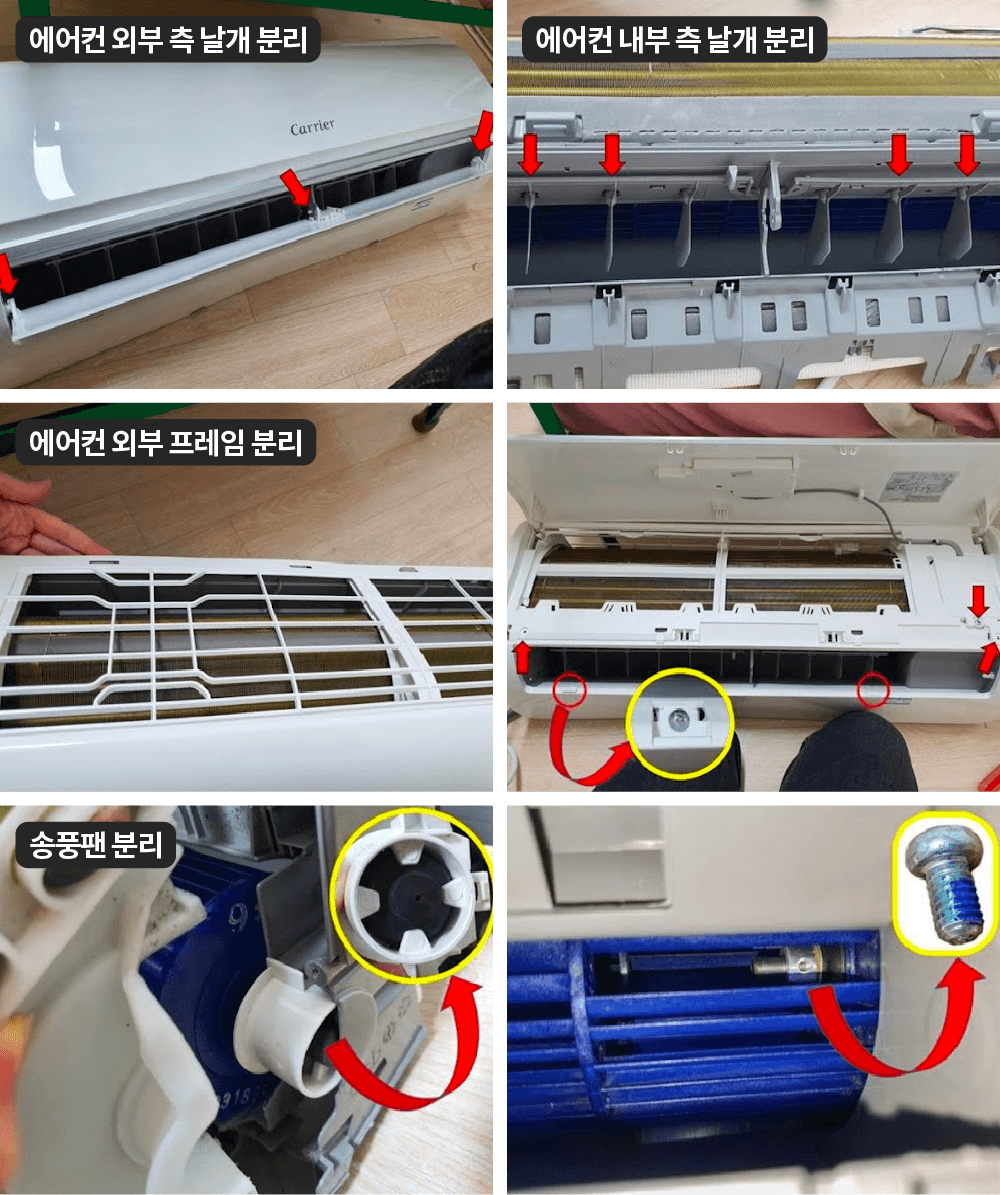 | 4단계: 풍향 조절 날개 분리하기 풍향 조절 날개는 2개 있습니다. 외부 측에는 상하로 바람을 조절하는 날개가, 내부 측에는 좌우로 바람을 조절하는 날개가 있어요. 아래의 3, 4번 그림과 같이 화살표 방향으로 당겨서 본체와 분리해 세척해 줍니다. 5단계: 에어컨 외부 프레임 분리하기 외부 프레임을 분해하기 위해서는 에어컨 내부 바디와 연결되는 볼트를 다 풀어줘야 해요. 전면 판넬 측에 있는 볼트와 상하 풍향 조절 날개 부분에 있는 볼트를 제거해 줍니다. 연결된 볼트를 다 풀어준 후에는 외부 프레임과 결합된 부위를 하나씩 탈착시켜서 분리해요. 6단계: 송풍팬 분해하기 가장 어려운 작업입니다. 먼저 송풍팬과 내부 축에 연결된 볼트를 찾아서 풀어줍니다. 그리고 에어컨 바디 측면에 있는 볼트를 풀어서, 측면 덮개를 열고 고정링을 분리해 줍니다. 그 후에 송풍팬을 분리해 주면 에어컨 청소하기 위한 분해 완료예요! |