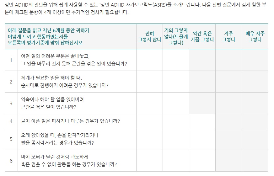 성인용 ADHD 검사 (성인 ADHD 자가진단) - 테스트하로