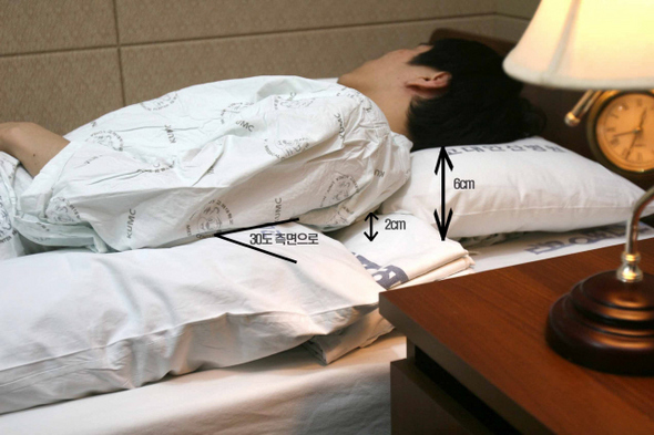 잠자는 자세를 3차원으로 분석한 결과 밝혀진 가장 좋은 자세(사진)는 목 뒤는 약 6㎝, 어깨는 2㎝ 이상 올려주고, 옆으로 누운 각도를 30도로 유지한 상태였다. 이런 자세로 자면 코골이와 수면무호흡증을 크게 개선했다