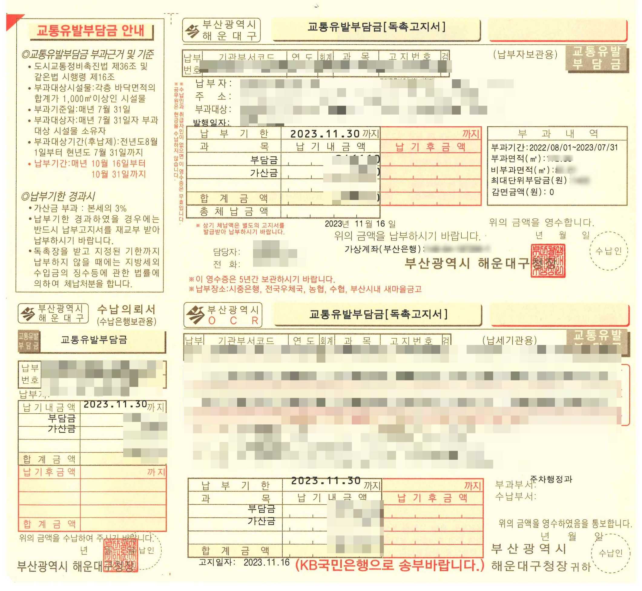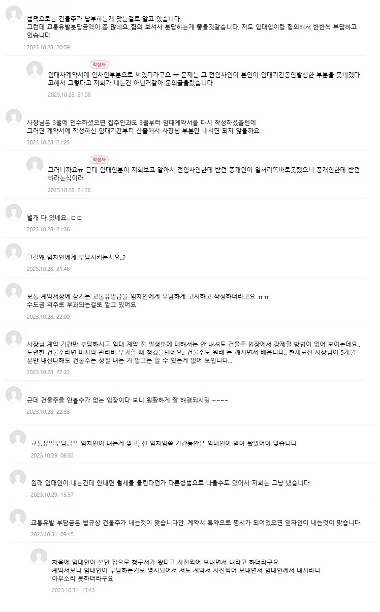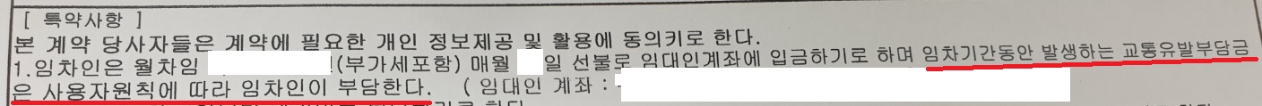교통유발부담금은 누가 내야되나 분분하던데 임대인-임차인 서로간에 합의하거나 임대차계약서에 적혀있는제 체크해보면 된다. 나는 임대차계약서 확인해보니 특약사항에 임차인이 부담하라고 되어있네....ㅎ