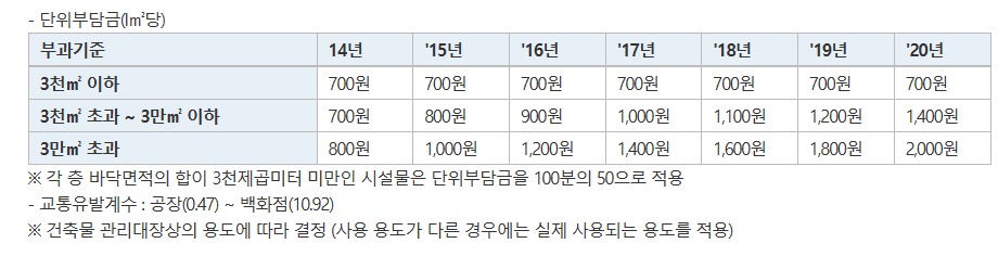 - 부담금 = 시설물의 각 층 바닥면적의 합계 x 단위부담금(I㎡당) x 교통유발계수
