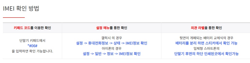 International Mobile Equipment Identity 의 약자로서 휴대전화 제조사는 전 세계 수많은 휴대전화를 구별하기 위해 전화기마다 15자리의 고유 번호를 부여하고 있다. 이 IMEI번호를 이용하여 ‘분실·도난 단말기’여부를 조회할 수 있고, ‘25%요금할인 단말기’ 대상 여부를 확인할 수 있다.