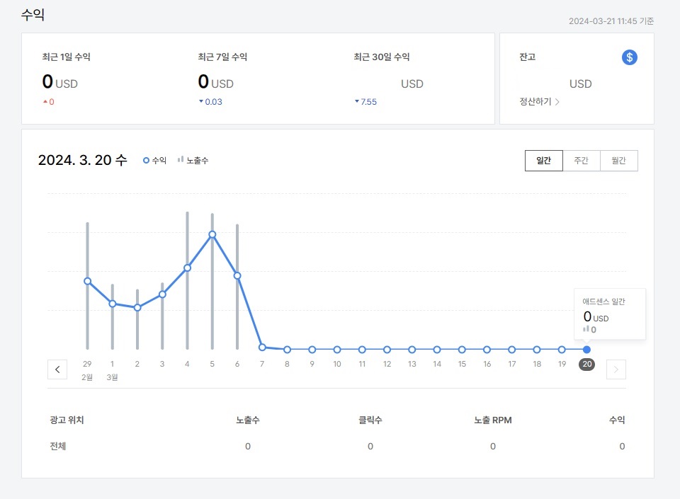 티스토리 블로그 방치하고 있긴했는데 오랜만에 들어갔다가 티스토리 수익이 3/7일부터 0원인 것을 발견....