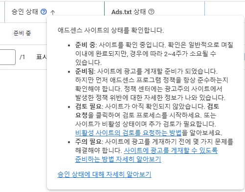 애드센스 사이트의 상태 / 승인 상태에 대해 자세히 알아보기
