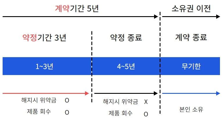 5년을 모두 사용할 경우 위약금과 회수 없이 그대로 소유권이 넘어와 계속 사용하실 수 있습니다.