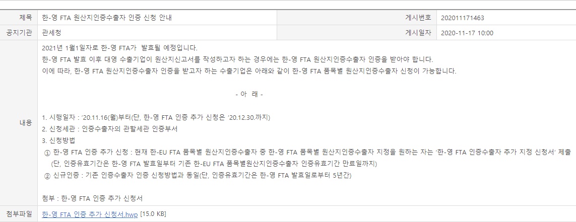 | [무역] 2021.1.1 한-영 FTA 발효 관련 질문과 답변 (1) | 2020.12.03 |