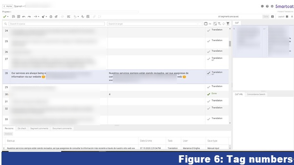Sometimes you will come across numbers in yellow hexagons in the left hand column. These are formatting tags that prompt the software there are changes in the text. For example, if there’s a hyper-link or something is superscripted. To update these, simply follow the step below. 1. Click your cursor in the middle column where you want the tag to go. Now, either double click the tag in the left hand column OR press Alt+[the tag number]. More methods on how to add tags are listed in the keyboard shortcuts below. 2. The number will now appear in the middle column where your cursor was (Figure 6).