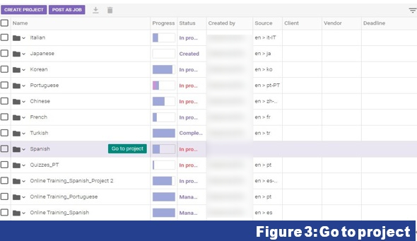 1. To get started on a project, hover over the one you want to edit (the project will turn purple. See Figure 3) and click ‘Go to project’. You will now be redirected to a new page with all the documents to be translated in a list.