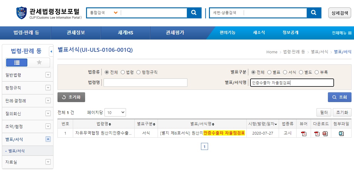 -서식 내려받기 : 별표서식 | 별표/서식 | 법령·판례 등 | 관세법령정보포털 CLIP (customs.go.kr)