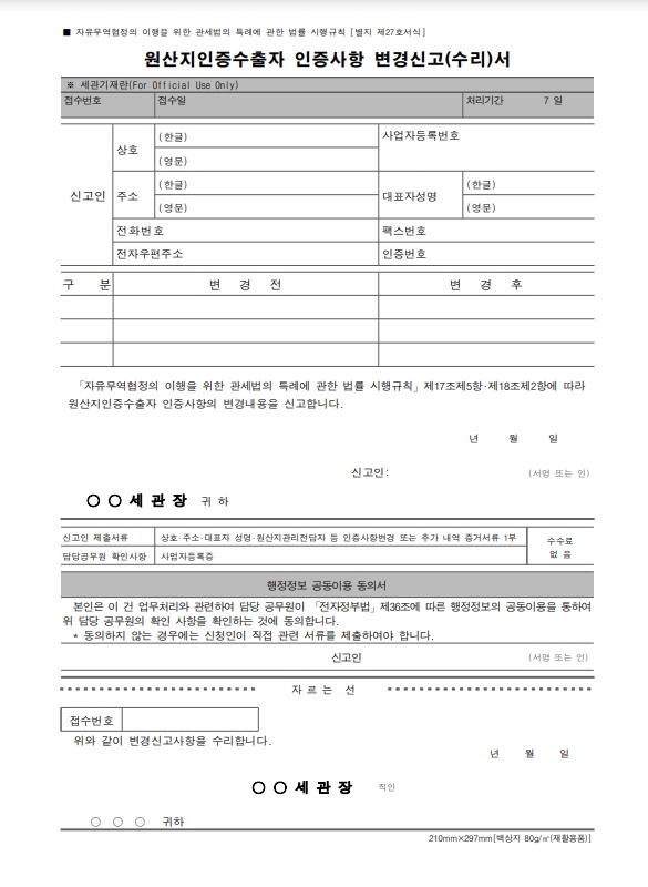 A. 인증 취득 후 '상호, 대표자, 주소, 원산지관리전담자'의 변경이 있다면 지정된 서식으로 인증 관할세관에 변경사항 신고해야 함.