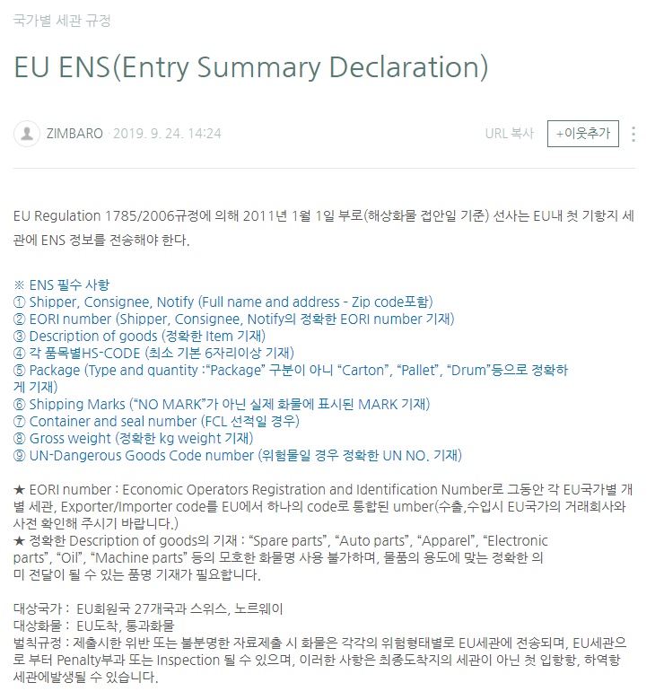 유럽에서 발생되는 비용으로 유럽 수출화물에 대한 적하목록 제출에 대한 수수료라고 한다. EDI 제출 시 BL 건당 발생한다.