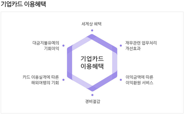 기업카드는 개인신용카드와 같이 음식점, 백화점 등 모든 신용카드 가맹점에서 사용이 가능하며, 발급카드의 종류에 따라 국내외 및 일부 가맹점 업종의 제한을 적용할 수 있습니다.